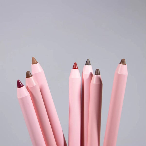 A collection of nine professional lip liner pencils by IKCosmetics, featuring matte pastel pink barrels and sharp precision tips. The lineup is displayed diagonally against a white background, showcasing a versatile range of highly pigmented swatches including deep earthy browns, a classic brick red, and rich berry tones. The creamy matte finish suggests a formula designed for both sharp definition and effortless blending.